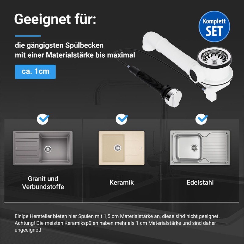 - Versatile: this sink strainer basket valve is suitable for almost all types of sinks, for example for a sink made of plastic, stainless steel, granite or ceramic. Material thickness should be approx. 1 cm