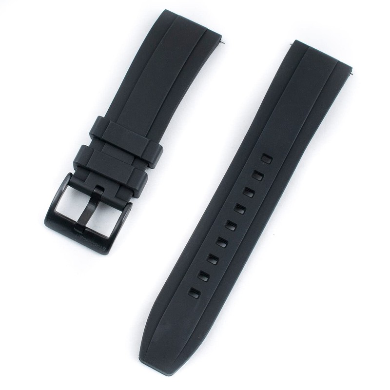 Genuine rubber two-piece watch strap with quick-release spring bars. Available in 20mm and 22mm lug widths with silver or black PVD buckles. Two floating keepers shaped to match the strap ridges. Nine adjustment holes mean that these straps should fit well on any size wrist.