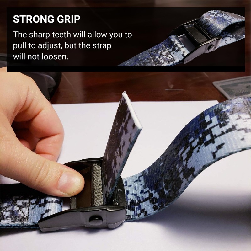 - EFFORTLESS THREADING – Take a glance at the direction of the teeth on the cam buckle and thread accordingly. The sharp teeth will allow you to pull to adjust, but the strap will not loosen.