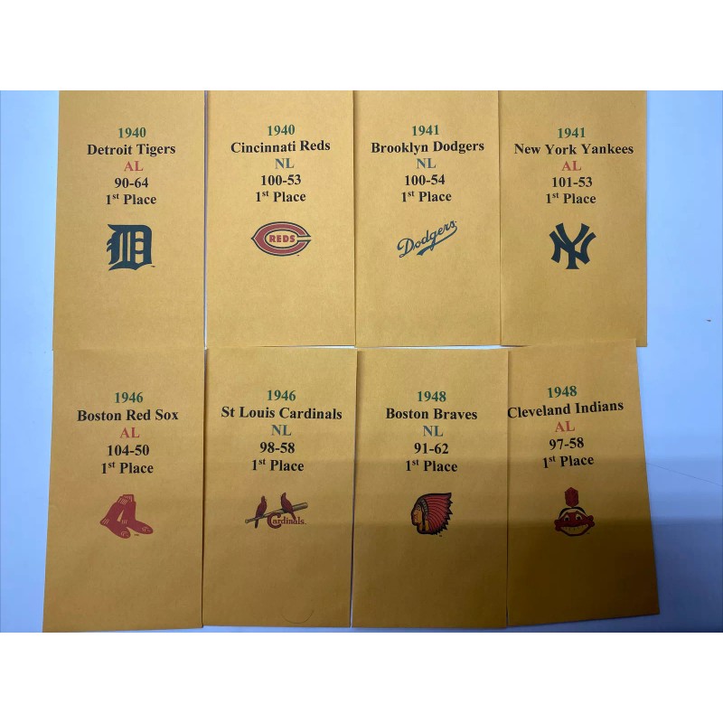 1940 Cincinnati Reds, 1940 Detroit Tigers, 1941 Brooklyn Dodgers, 1941 New York Yankees, 1946 Boston Red Sox, 1946 St. Louis Cardinals, 1948 Boston Braves and 1948 Cleveland Indians