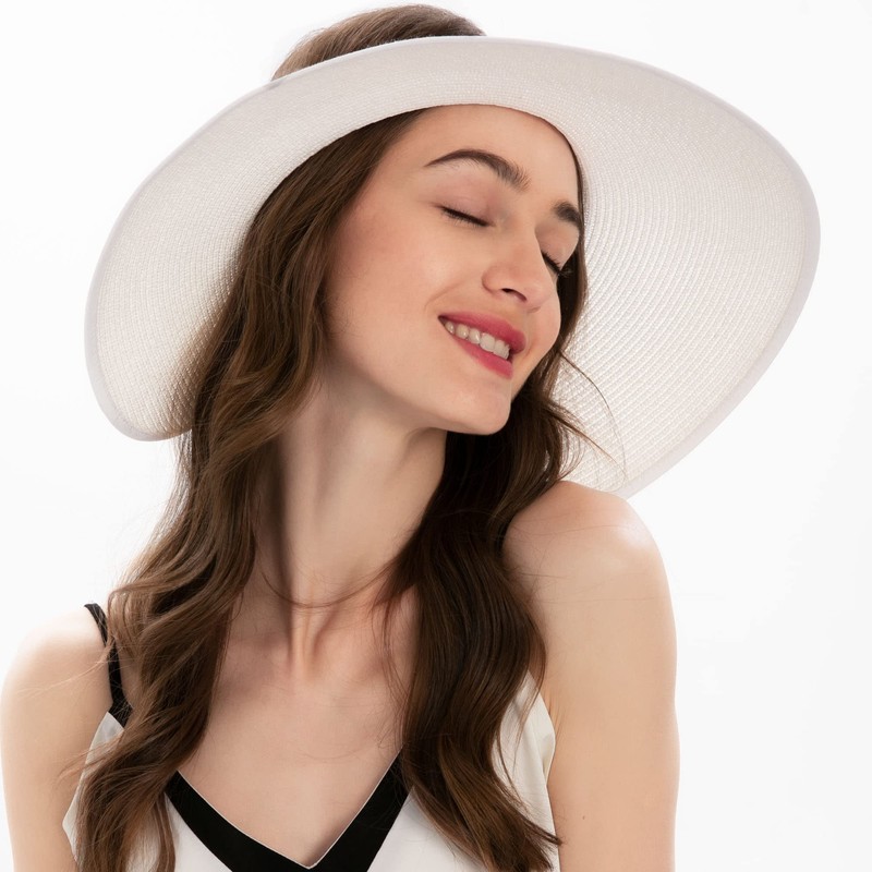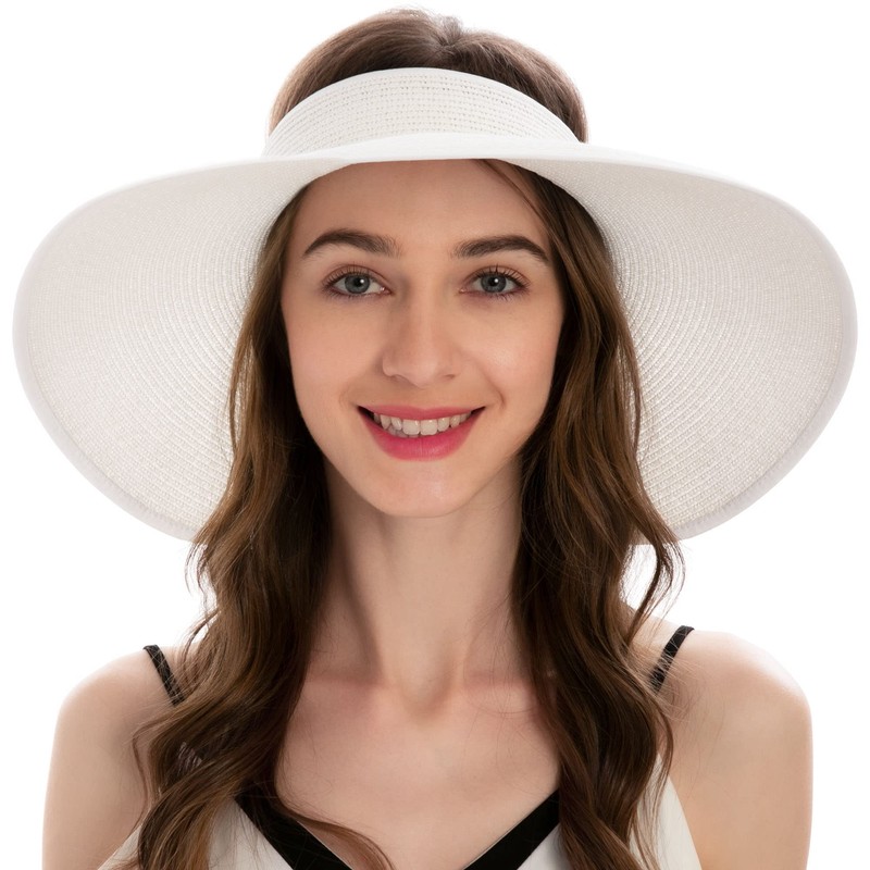 Straw Visor Hat for Women Sun Visor Packable Sun Hat Women Bow Visor Roll Up White Sun Hat with Ponytail Hole