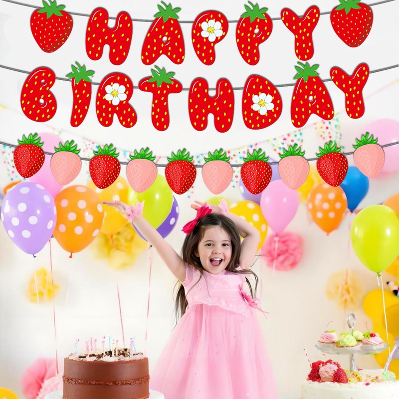 - 【Package】You will get 'HAPPY BIRTHDAY' banner ,a bunch of strawberry banner and one ribbon with one needle(You need to DIY).