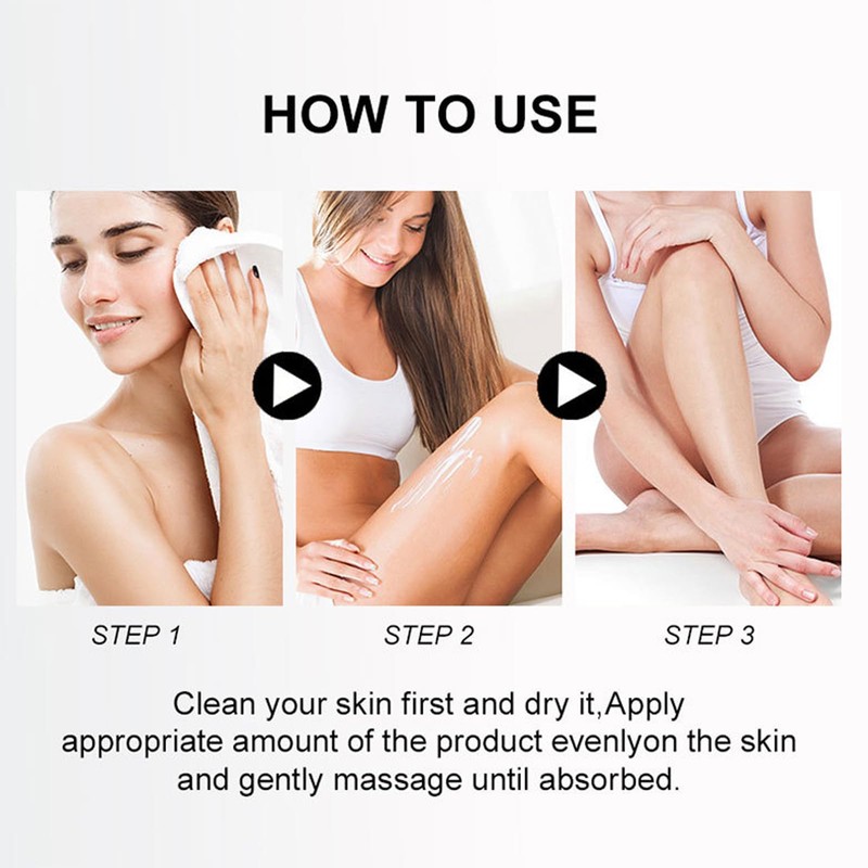 - HOW TO USE -- 1 Clean the skin and keep the skin dry 2 Take out this leg cream, spread it evenly and massage until absorbed. 3 Wash off with water after fully absorbed 4 With regular use for better results.Achieve even-toned, refined skin in 2–4 weeks with consistent use.