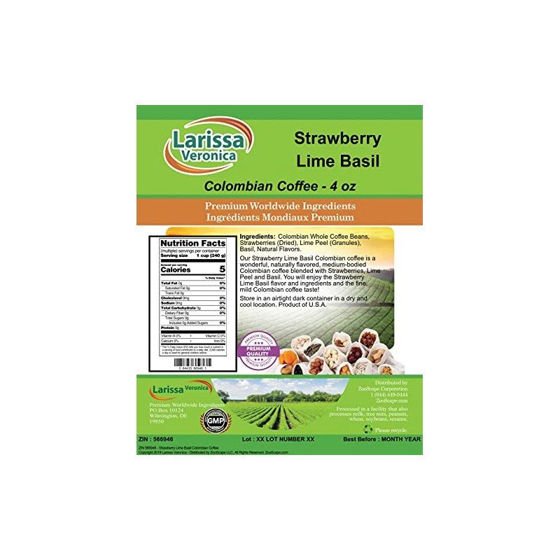 - Our Strawberry Lime Basil Colombian coffee is a wonderful, naturally flavored, medium-bodied Colombian coffee blended with Strawberries, Lime Peel and Basil. You will enjoy the Strawberry Lime Basil flavor and ingredients and the fine, mild Colombian coffee taste! - Ingredients: Colombian coffee (whole coffee beans), Strawberries, Lime Peel, Basil and Natural Strawberry Lime Basil Flavor.