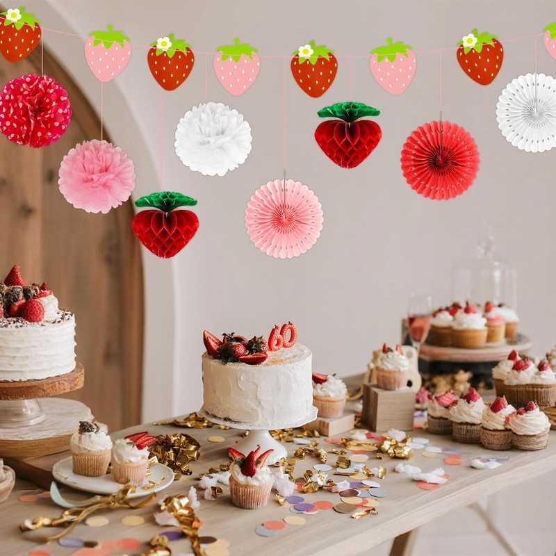 - SIZE: The decorations include 10-inch tissue paper pom poms, 6-inch honeycomb balls, 10-inch paper fans, and a garland with 8 strawberry pieces for versatile sizing.