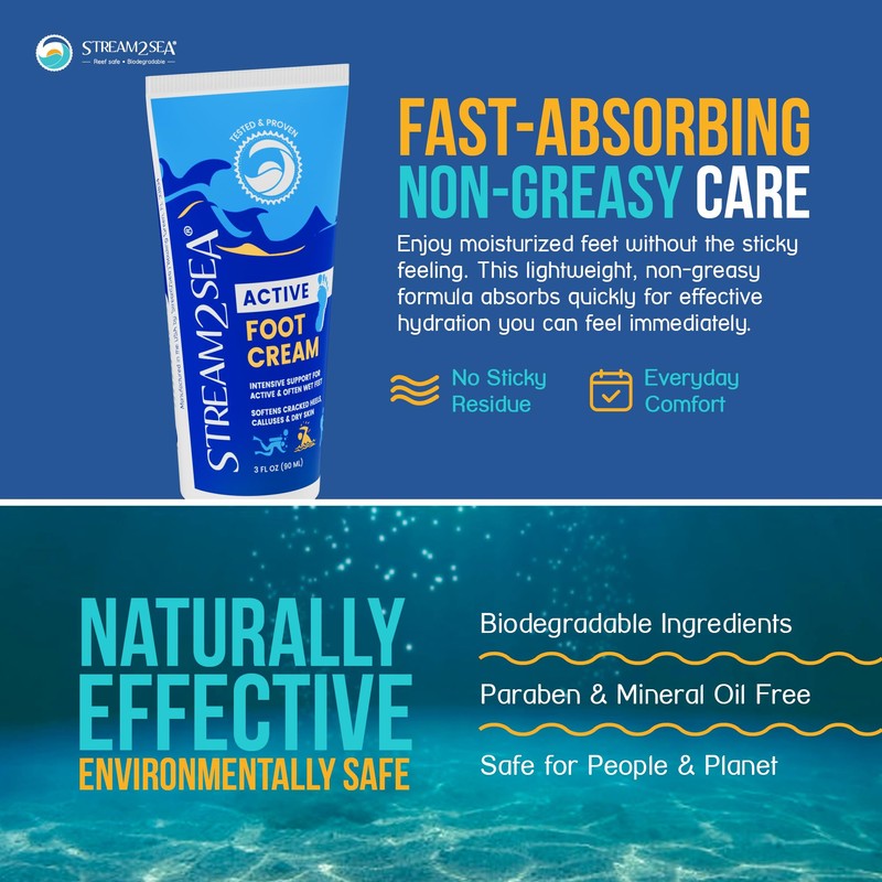 STREAM 2 SEA Active Foot Cream, Intensive Support for Active & Often Wet Feet - Softens Cracked Heels, Calluses & Dry Skin, Enriched with Neem and Tea Tree, Fast-absorbing and Non-greasy - 3 Fl oz