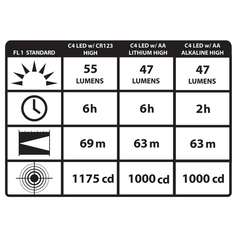 - White C4 LED w/AA: 47 lumens; 1,000 candela; 63m beam distance 5mm IR LED: 25mW/sr (min) radiant intensity