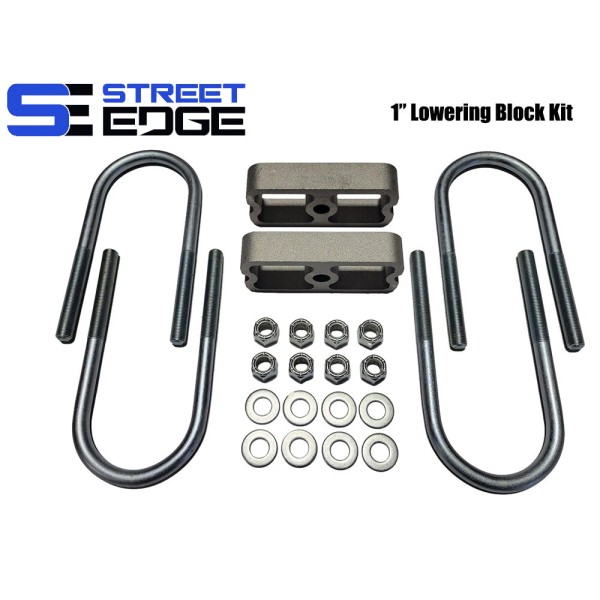 Street Edge Lowering Block Kits are designed to lower the rear of your truck 1". (See title for exact lowering height) All Street Edge lowering blocks are built of extruded aluminum and come complete with cold rolled 1/2" diameter U-bolts, SAE plated washers and self locking nuts.