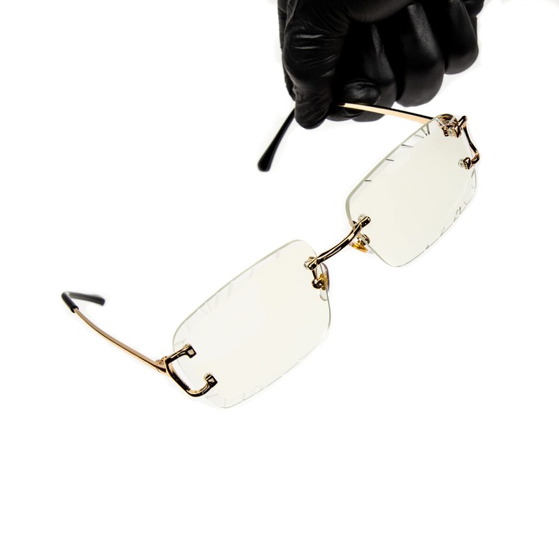 - The rimless unisex gold metal, iconic glasses are known for their defined square polycarbante gem cut lenses and distinct shape. A curved brow bar, adjustable nose pads, and thin metal temples with plastic end tips rest comfortably behind the ears. These trendy frames will be your everyday go-to accessory with all your looks.