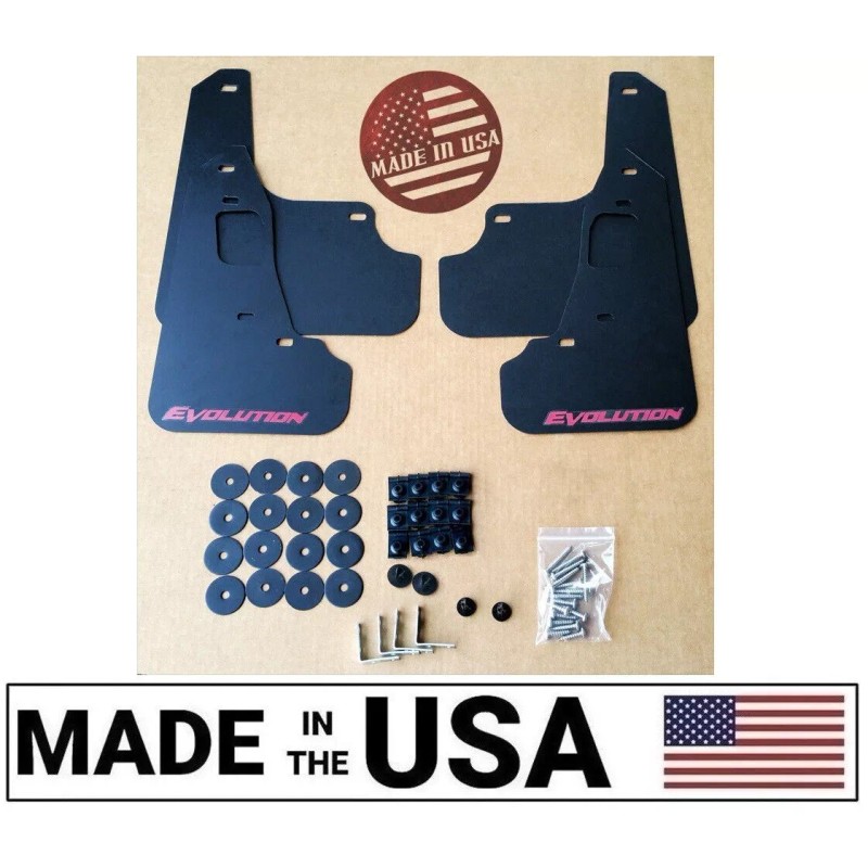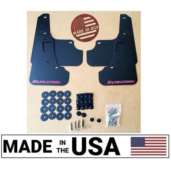 StreetRays 08-15 Mitsubishi EVO X Mud Flaps Set BLACK w/ Logo & Hardware Kit Color: BLACK Mud Flaps with "EVO" Logo (Default color for Logo is "RED" but upon request, we can provide White / blue / red Logo) Material: UV Resistant Poly-blend Plastic This is a complete kit with installation hardware: Our mud flaps come with stainless screws & complete installation hardware as well as a short installation guide. This is the best bang for your buck! everything you need to install all the mud flaps easily are included in this kit. Like everything else StreetRays, our mud flaps are made in-house in Central Texas (Austin) with CNC cutter and forming. Just like our CNC BIllet Parts, these mud flaps all precision cut to specific design and each and everyone one them are inspected to ensure consistent end product for our user is perfect. Our mud flaps are available in 2 different material. This is our poly-blend mud flap kit complete with hardware & instructions and the mud flaps are all pre-cut ready to install (which should only take an hour per side). Although these poly-blend sheet is thinner than our Urethane ones, they are 100% UV resistant, anti-warp & most importantly, they will sustain all the beating any environment will give them! every single time!