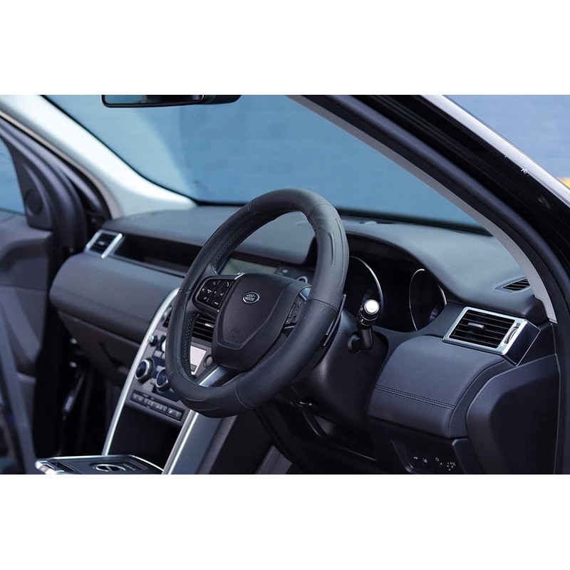 - UPGRADE YOUR INTERIOR: The design of this steering wheel glove is finished in a, Black Leather Finish around the sides, this will enhance the interior of your vehicle giving it a warm and sporty feeling.