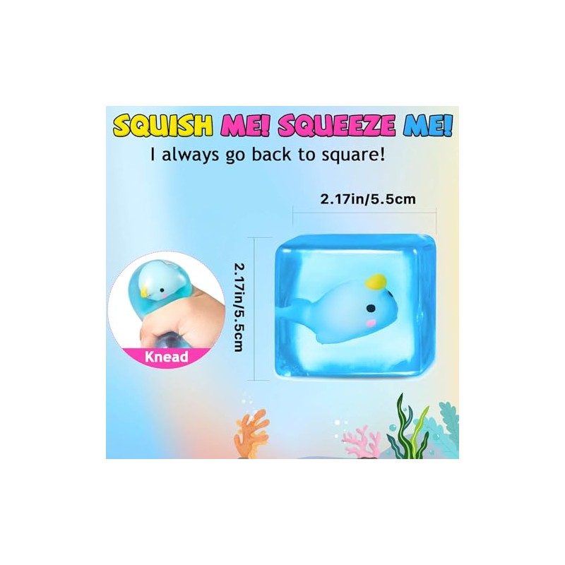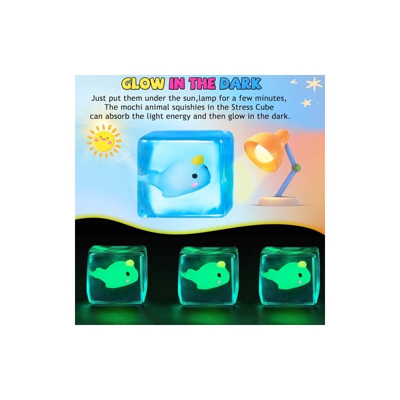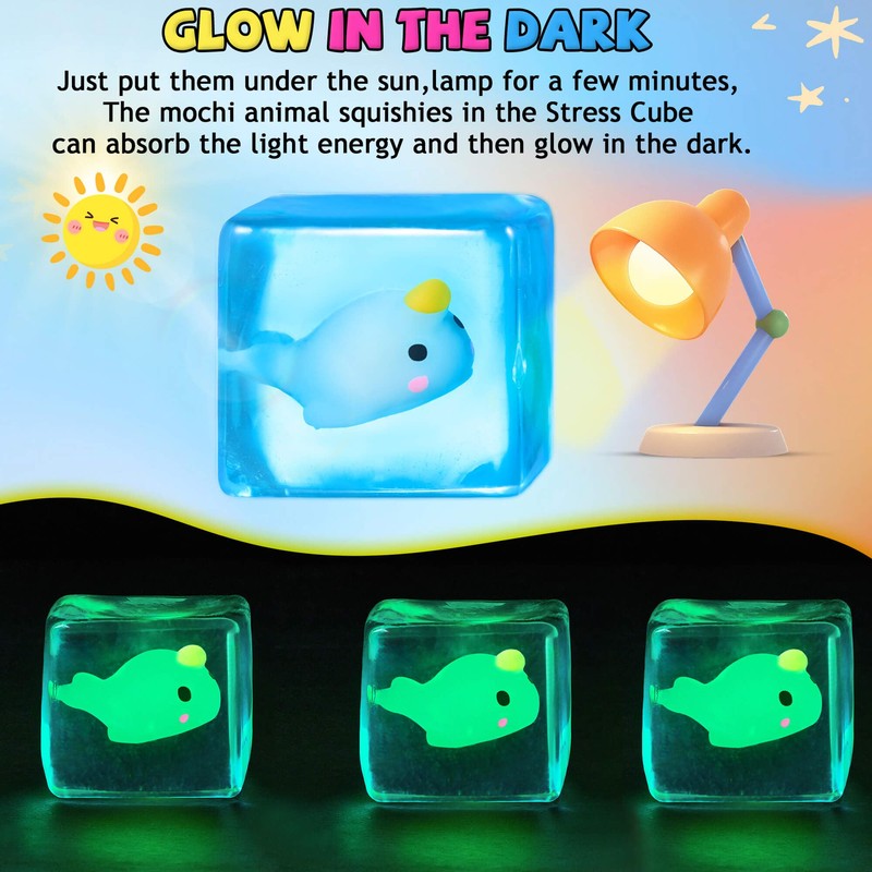 - 【Innovative Design】: Experience the innovative design of our stress cube, featuring an ice-shaped exterior and glow in the dark mochi animal squishies(clownfish, narwhal, Manta Ray).These fun sensory cubes provide a calming tactile experience, offering effective stress relief for individuals with ADHD, OCD, autism, or heightened anxiety.