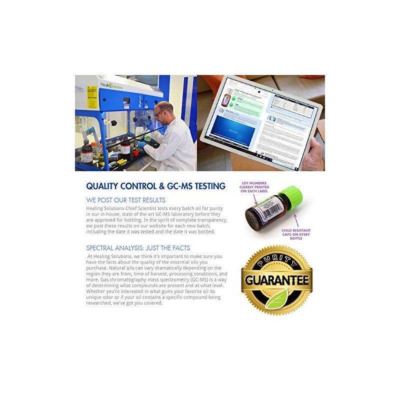 Healing Solutions 100% Pure Essential oils are bottled in UV blocking amber essential oil bottles. Our Chief Scientist tests every batch of oil for purity in our in-house, state of art GC-MS Laboratory. This ensures every product sold is 100% pure essential oil! **The Leading Aromatherapy Associations (Alliance of International Aromatherapists (AIA), International Aromatherapy and Aromatic Medicine Association, Aromatherapy Trade Council, and others) all state that essential oils should not be taken internally (regardless of purity or organic origin) unless under the guidance of a health care practitioner trained at an appropriate level . As such, all of our oils carry a label warning that the product is NOT FOR INTERNAL USE.** What sets Healing Solutions Essential Oils apart is superior cultivation of ingredients that are the best in the world. Combined with superior distillation and bottling care process, We GUARANTEE that our oils are aromatically superior and more effective than any other oils - if you disagree we will refund your money!