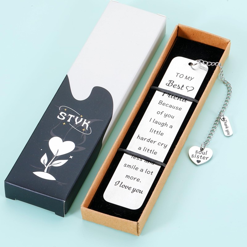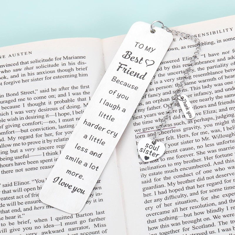 - ❤Bookmark Gifts For Best Friend: This bookmark is engraved "to my best friend because of you i laugh a little harder cry a little less and smile a lot more i love you" with a soul sister pendant chain. A great appreciation gift for your best friends! Birthday gifts for women friendship. This friendship gift will be ideal gifts for your best friends, bff, long distance friends and so on, and it will clearly show your emotions to them, making them feel warm and happy.