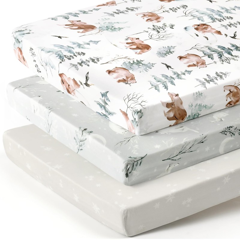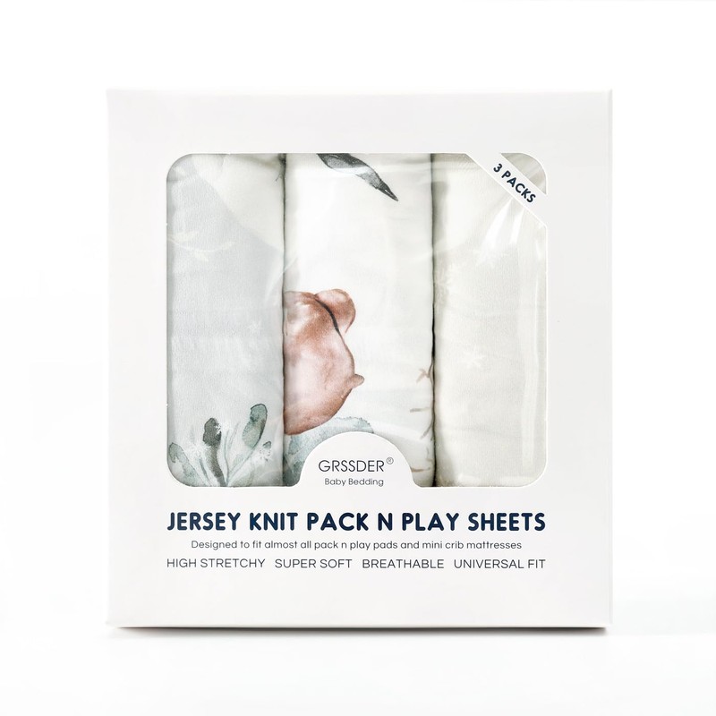 Stretchy Ultra Soft Jersey Knit Fitted Pack n Play Sheets 3 Pack, Portable/Mini Crib Sheets for Boys and Girls, Universal Fit for Pack N Plays Safe and Snug, Stylish Pattern of Bear and Wolf Print