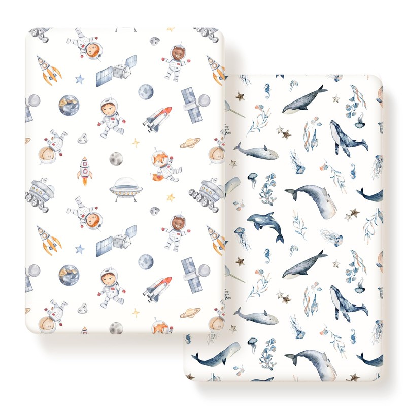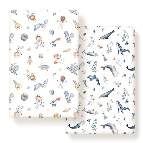 Stretchy Ultra Soft Jersey Knit Fitted Pack n Play Sheets Set 2 Pack, Portable/Mini Crib Sheets for Girls, Universal Fit for Pack N Plays Safe and Snug, Cute Sea Fish & Space Print