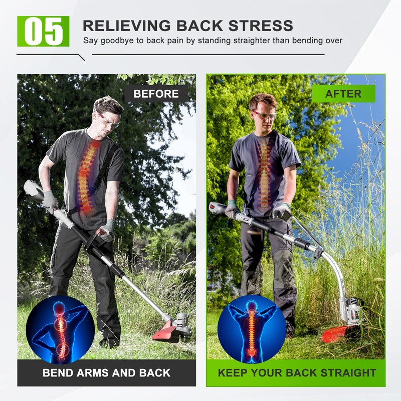 - Ergonomic Grip Handle: This Trimmer Grip is ergonomically designed. It allows the operator to maintain an upright position while working, and also reduces back and lumbar strain by relieving pressure on the waist during prolonged mowing. With the mower handle installed, if the arm or back is bent, simply slide the vise up or down into place