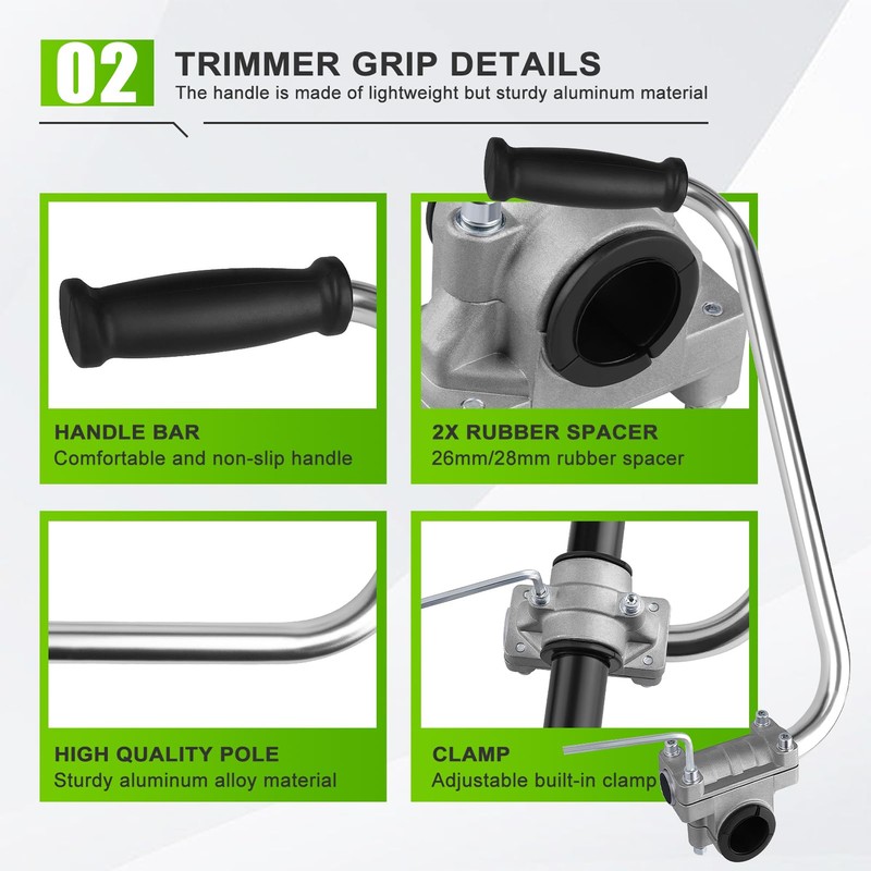 - Wide Application: The trimmer grip comes with two rubber washers (26mm/28mm), which can be selected to fit according to the diameter of the shaft.The trimmer grip fits most trimmer shafts, such as heavy trimmers, light trimmers and weeders.Simple and practical for yard maintenance, lawn care and landscaping edging and trimming