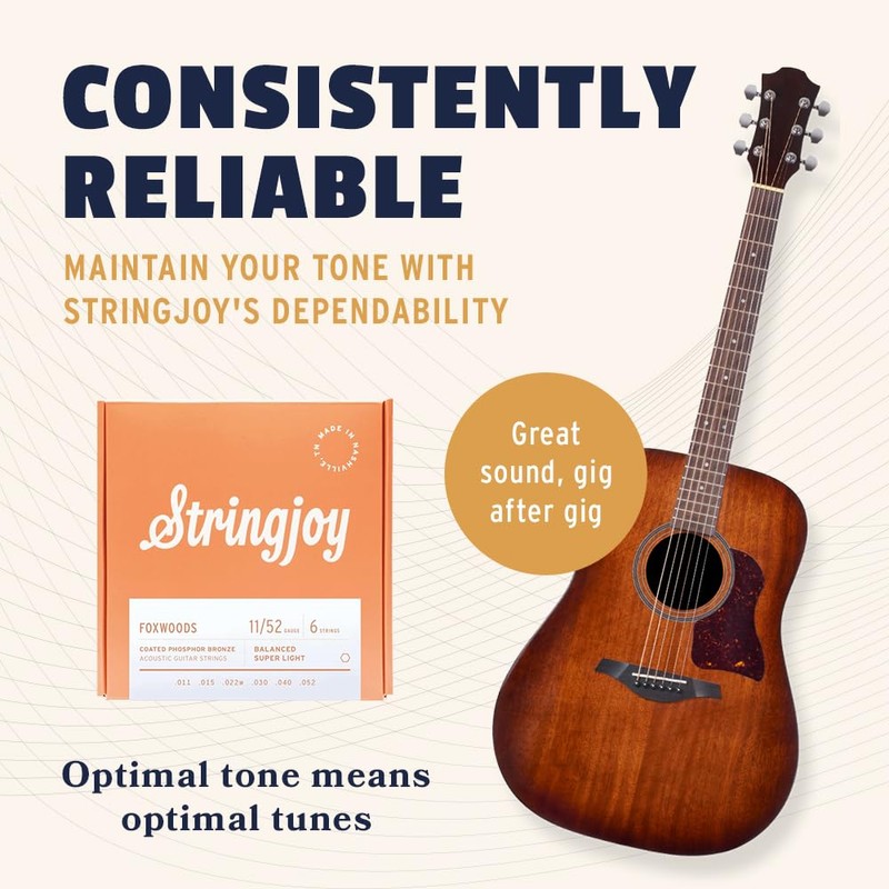 Stringjoy Balanced Super Light Foxwoods Coated Phosphor Bronze Acoustic Guitar Strings 11-52, FW1152, Long-Lasting Tone and Sound Quality, Acoustic 6 String Set, 2-Pack