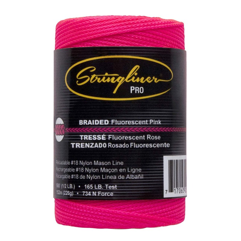 Stringliner mason/construction line is made of durable #18 nylon with a tensile strength of 165 lbs. This contractor pack features 6 rolls of 500 ft. fluorescent pink replacement twine on 1" diameter cores. The line is braided so it is more durable and resistant to abrasion. It also won't spin as much when used with a plumb bob. The bright fluorescent pink color is highly visible.