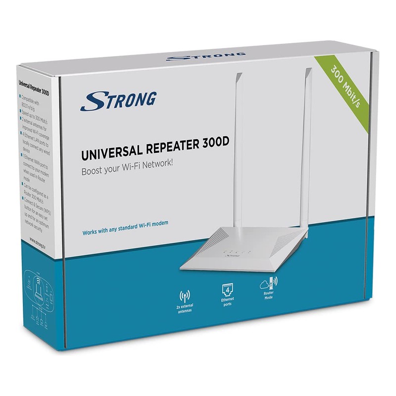 STRONG WLAN Repeater 300D, Operating Modes: Universal Repeater/Router, 300 Mbit/s at 2.4 GHz, 4 LAN Ports, WLAN Amplifier - White, NA