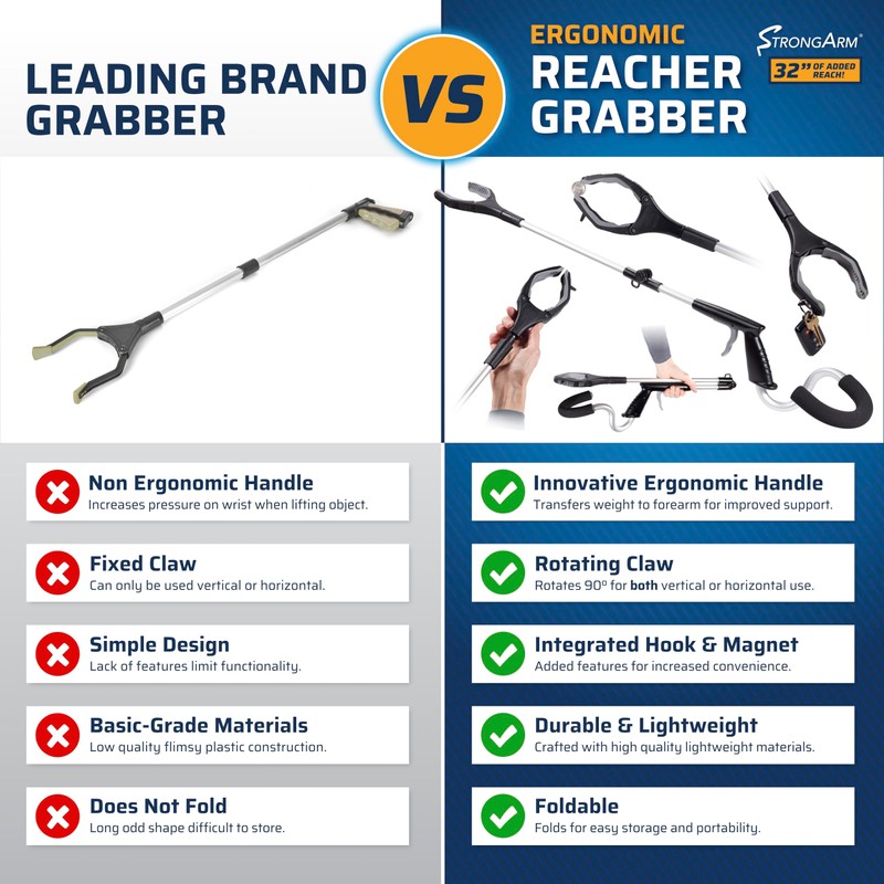 - Extend Your Reach: The StrongArm Reacher Grabber empowers you to access items up to 32 inches away with ease, reducing the need for strenuous bending or stretching. Whether it's retrieving objects from high shelves, tight spaces, or the floor, this versatile tool offers unparalleled convenience in everyday tasks.