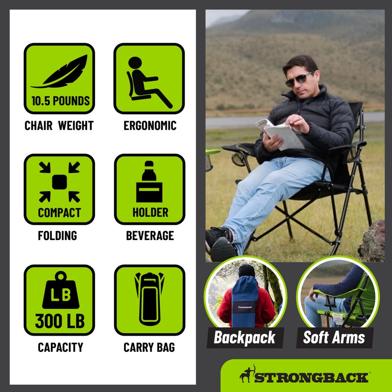 STRONGBACK Camping Chair Guru Heavy Duty Camping Chairs with Lumbar Support - Backpack Folding Camp Chair - Lime Green