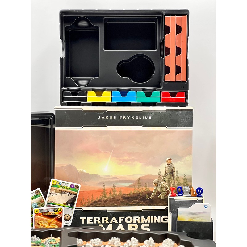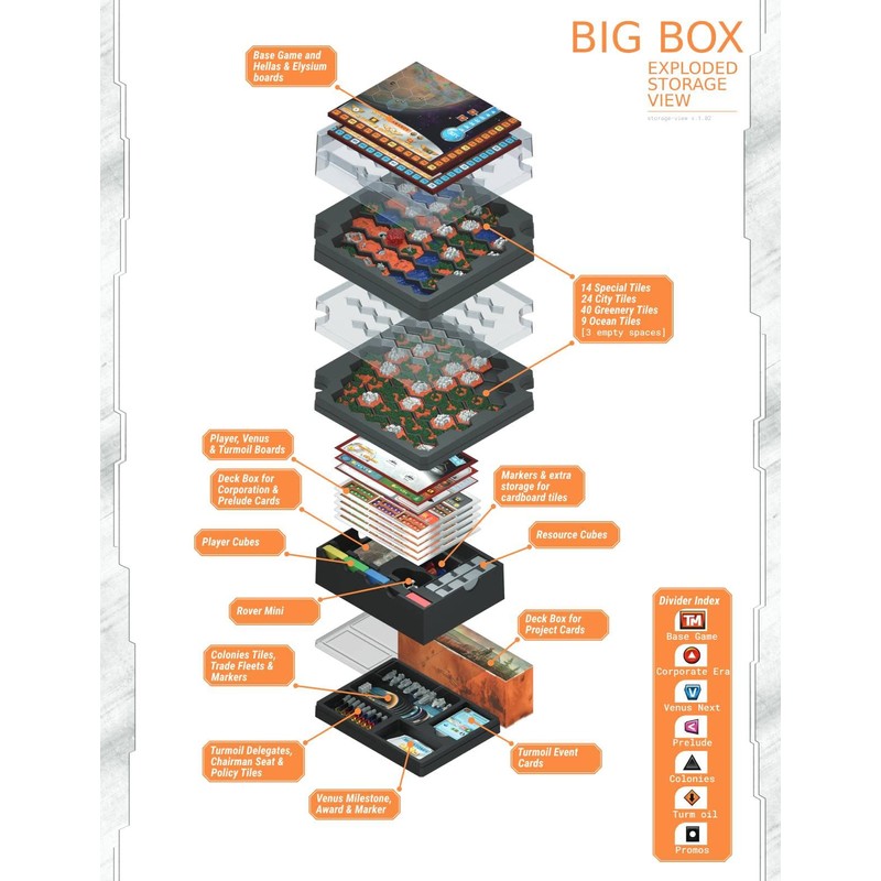 - Terraforming Mars: Big Box is both a storage option for all the Terraforming Mars material released to date — the base game, five expansions, and the first-player rover — and a set of 3D terrain tiles to dress up the game.