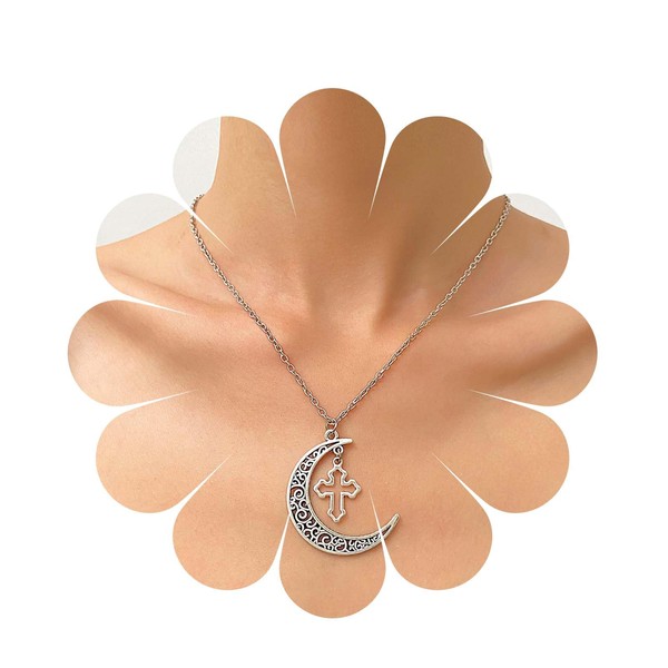 Sttiafay Boho Moon Cross Pendant Necklace Crescent Moon Choker Necklace Hollow Cross Choker Necklace Chain Silver Filigree Moon Necklace Jewelry for Women