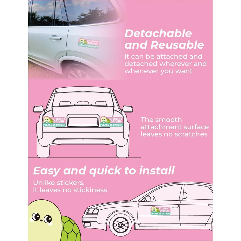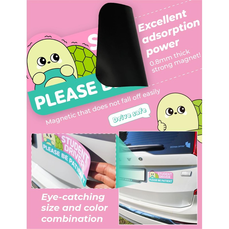 - 🐢 Cute turtle design : The turtle holding the steering wheel and trembling indicates that you are a beginner driver. The combination of pink and mint, along with the cute turtle character, encourages other drivers to be more lenient towards you, giving you plenty of space and respect.