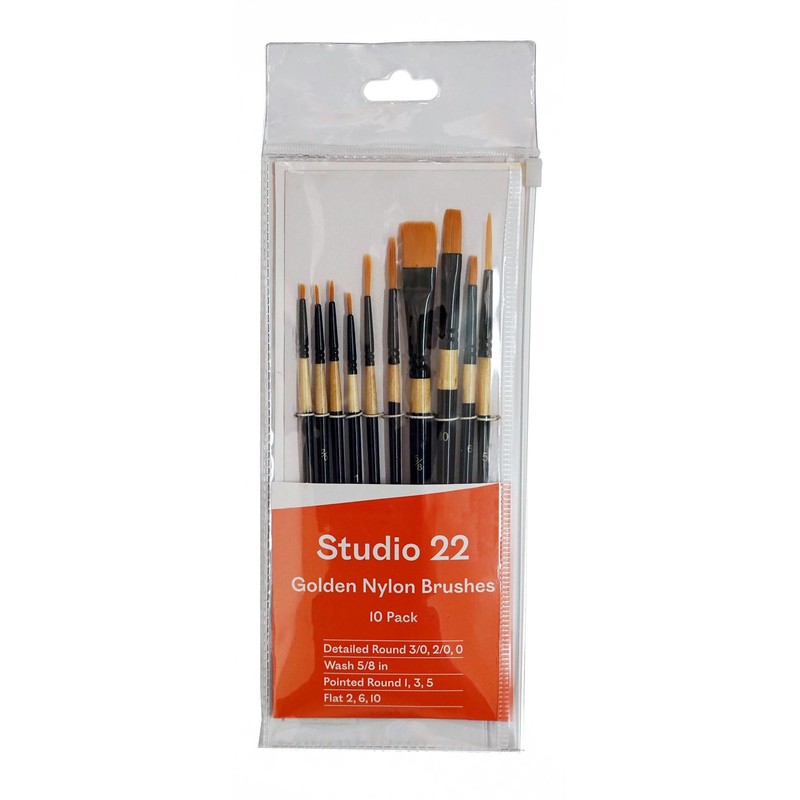 - STUDIO 22 GOLD NYLON 10PC BRUSH SET: 10 assorted synthetic hair brushes with a soft yet durable nylon filament and short lacquered wooden handles protected with a metal ferrule. Includes: Fine detail round (2/0, 3/0, 0 and 1), Liner (3 and 5), Long flat (2 and 10), Filbert (6) and Flat (5/8").
