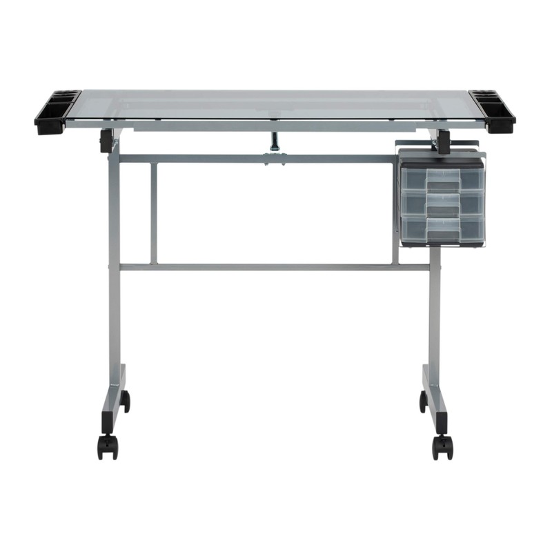 Studio Designs Vision Craft and Drawing Station - 35.5" W by 23.75" D Silver-Blue Glass Top Drafting Table with Pencil Drawers, Side Trays, & Built-In Pencil Ledge - Angle Adjustable Work Surface