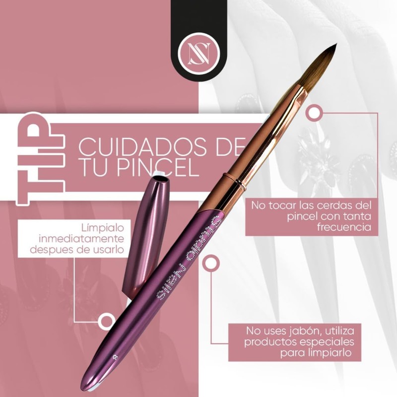 - Excelencia en Aplicación: El Pincel Studio Nails, con cerdas 100% Kolinsky, es perfecto para aplicar uñas acrílicas con gran poder de absorción y creación de perlas.