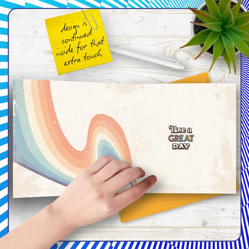 - WHAT DO YOU GET: The cards are printed on both sides with the inside print saying 'Have A Great Day' and ample space for your own personal message. The unique fun design is printed on a specially sourced and environmentally responsible board. At 360 microns thick the natural white one-sided gloss board has a quality look and feel. Supplied with a coloured gummed envelope to complement the design and ready to be sealed and sent in the post.