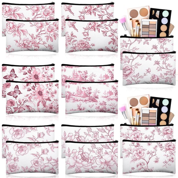 Stuffygreenus 16 Pcs Floral Cosmetic Bags Bulk for Women Pink and White Floral Makeup Bags Chinoiserie Canvas Travel Zipper Pouches Aesthetic Toiletry Bag for Girls Teacher Appreciation Supplies