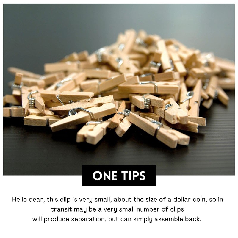 - đČăMore About Our Mini Clips for Photosă- We'll present you with some extra wooden mini clothespins in the packing. The small clothing pins can be disassembled and reassembled. You can also use tiny cloths pins that are not assembled to make small mini chairs and small animals. If you love the unique style, you can also use the to create your own chic mini earrings.