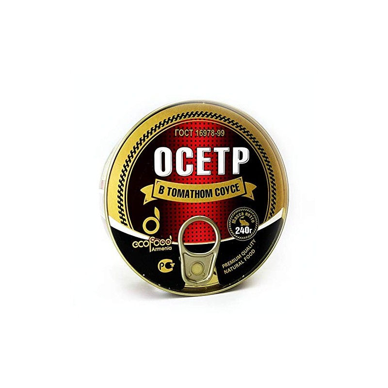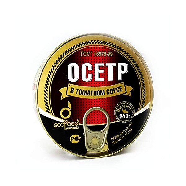 - Ingredients: Sturgeon (168g), salt, tomato sauce (tomato paste, sugar, salt, onion, vegetable oil, pepper, water).