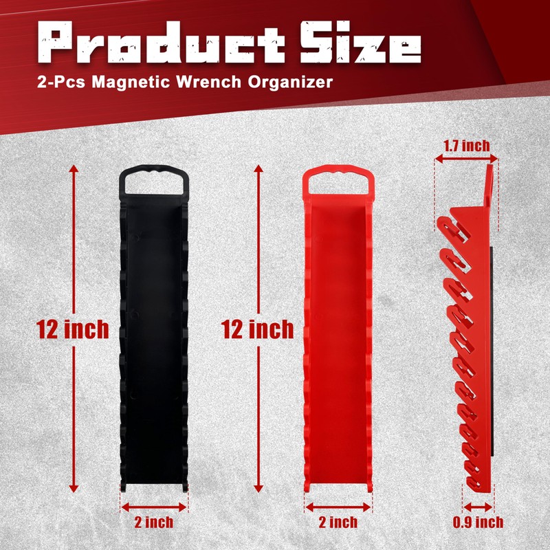【Versatility】Whether it's a home garage, professional shop or industrial repair station, this magnetic wrench organizer will keep your tools organized for a variety of work environments and needs! Also available in red and black to distinguish between metric and SAE wrenches or various wrench types. 【Package Include】The organizer set includes two magnetic wrench organizers measuring 2 x 12 inches, each shelf holds 12 wrenches, for a total of 24 wrenches on both shelves. 【Material】The magnetic wrench organizer is made of ABS plastic and thick magnets to ensure a strong hold while enhancing the sturdiness and durability of the product to withstand the wear and tear and heavy pressure of long-term use. 【Space Saving】The compact design allows this magnetic wrench organizer to maximize wall space while reducing clutter in your work area. Ideal for work environments with limited space. 【Easy to use】Easy to install with detailed installation guide, you can easily fix it on the wall. Magnetic adsorption design makes tool access quick and easy, improve work efficiency.