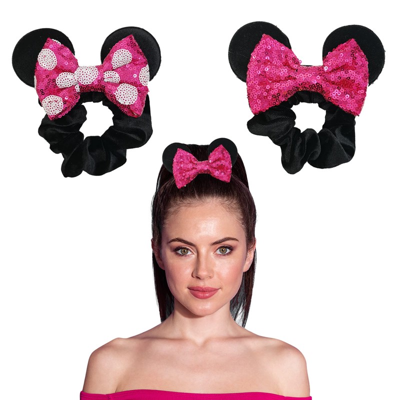 Styla Hair 2pk Mouse Ear Scrunchies for Kids Velvet Hair Bow Scrunchies for Women - Sparkle Sequins Mouse Hair Bands for Pony Tail (Hot Pink)