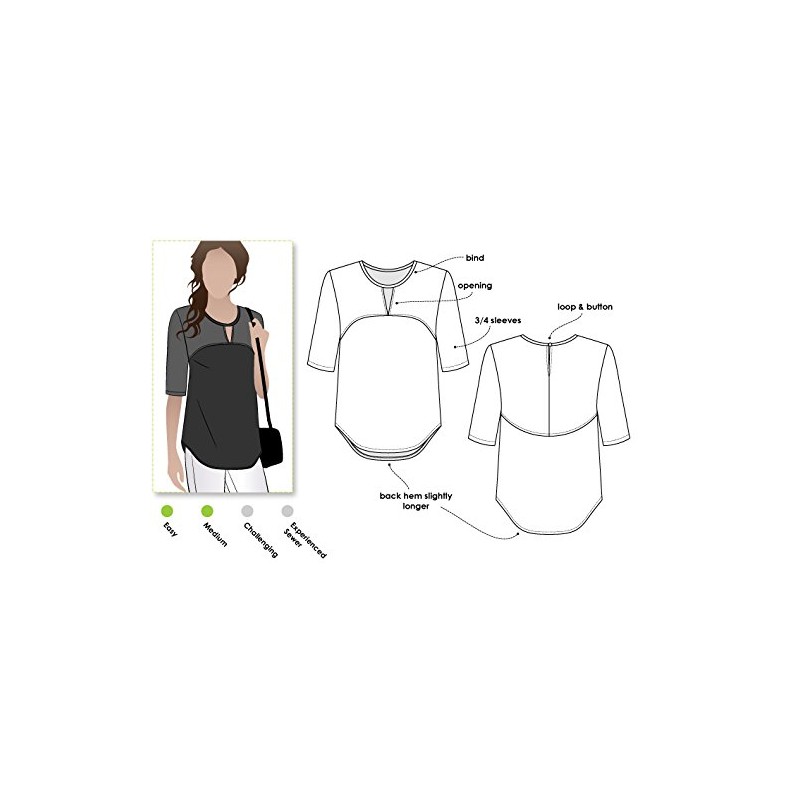 This is a Style Arc sewing pattern for a gorgeous woven top for women. This is just a great top and one of Style Arc's best sellers. The curved front and back yokes make it a fashionable style that can be worn on any occasion. Colour-block this style in your favourite colours to create your unique look. FABRIC SUGGESTION: Silk, crepe, rayon or any soft woven fabric. FABRIC ESTIMATE - Fabric Width: 110 cm (44 in) > Sizes 4 - 18: 150 cm (1.65 yd) > Sizes 20 - 30: 190 cm (2 yd). TRIMS: Hook & eye or button & loop for back neck.