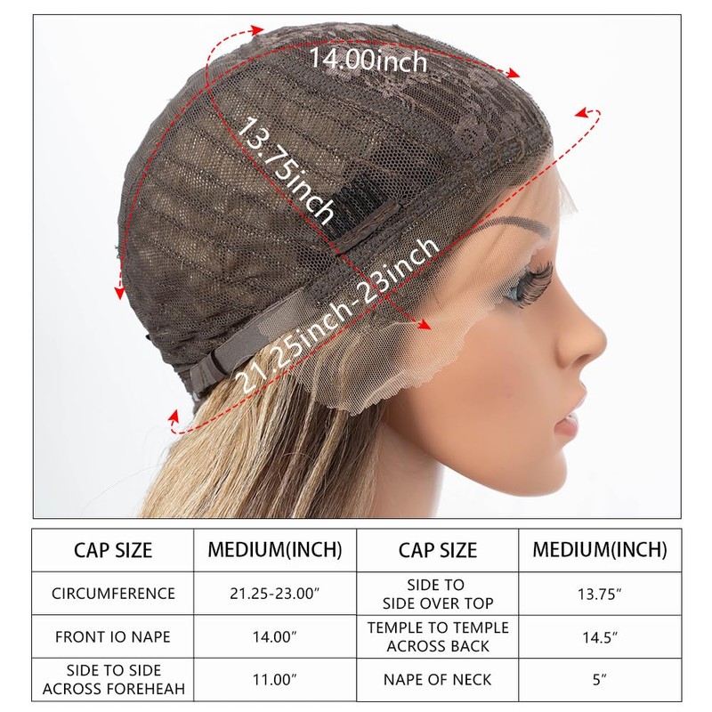 The wig cap circumference is about 22-23 inches. It's also designed with three security combs and two adjustable straps if in need to make any cap adjustment.