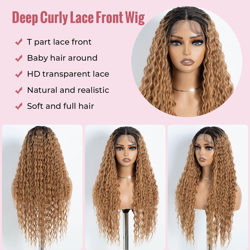 Style Icon Long Deep Curly Wave Lace Front Wig 30 inches Honey Brown Long Water Wave Wig for Women T Part Lace Wig with Baby Hair Synthetic Heat Resistant Fiber (TT4/C27)