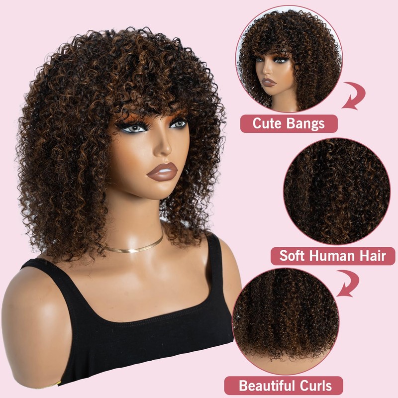 - Short Curly Bangs Wig: The addition of bangs adds a stylish and youthful touch. What truly sets this curly wig apart is the use of human hair, ensuring a realistic feel and the ability to style it to your liking
