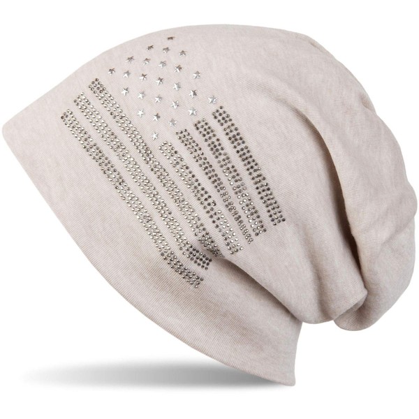 styleBREAKER Noble Beanie hat in USA Flag Design with Rhinestone Rivets, Unisex 04024042, Colour:Beige