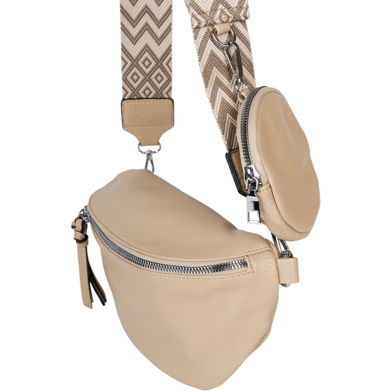 The elegant 2-piece set includes a half-moon shaped handbag that can be worn as a crossbody bag, shoulder bag, or messenger bag, and a small round purse that can be attached to the shoulder strap, perfectly completing your outfit. The bag can be closed with a 2-way zipper and offers additional storage with a zipper pocket on the back. The main compartment of the crossbody bag provides enough space for a wallet, keys, smartphone, and small items that you want to have readily available on the go. The wide shoulder strap with a zigzag diamond pattern made of high-quality woven fabric can be detached via carabiners. This allows you to give your solid-colored messenger bag a unique style at any time and to restyle it for any occasion.