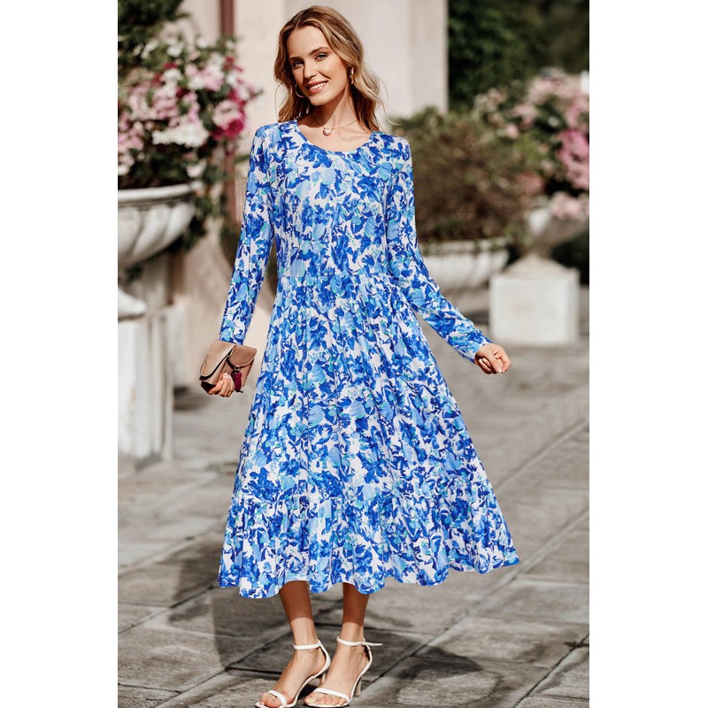 STYLEWORD Womens Fall Dresses 2024 Casual Long Sleeve Midi Dress A Line Flowy Formal Party Going Out Dresses Pockets (White Blue Floral,S)