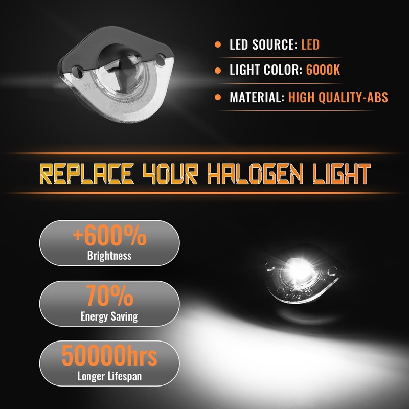 Our tag lights has 2 LED bulbs + 2 housing. 10X Brighter Than OEM light bulbs safety at night driving. Non-polarity, 12-30 volt stable output illuminates and brightness is close to 12 am sunshine, 360°uniform ray. 80% reduces LED run super hot and burn out within few weeks than other SMD LED flickering lamp or OEM halogen bulb. IP67 waterproof and Fully sealed designed. Tag light cover lens is made of PC materials, not faded with long-time exposure and can adapt to all kinds of extreme weather, Full Kit Package & 1 Year After-Sales Support.