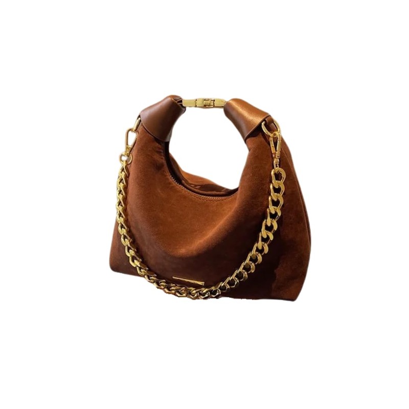 Stylish Brown Suede and Leather Handbag with Gold Chain Handle (Brown)