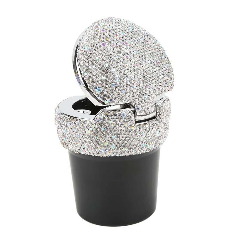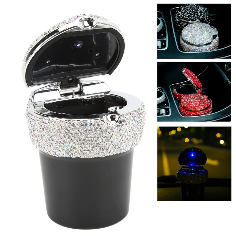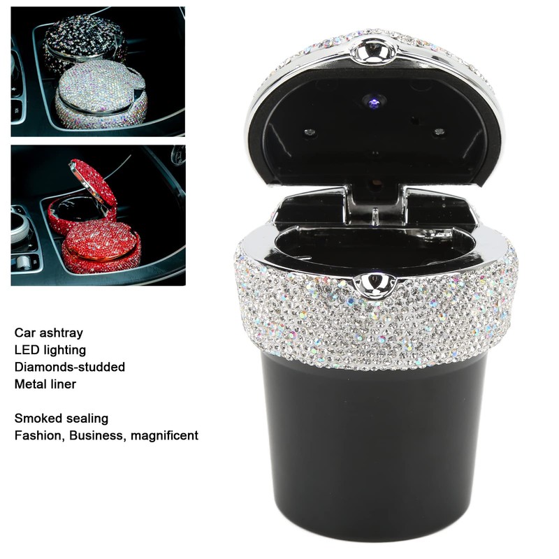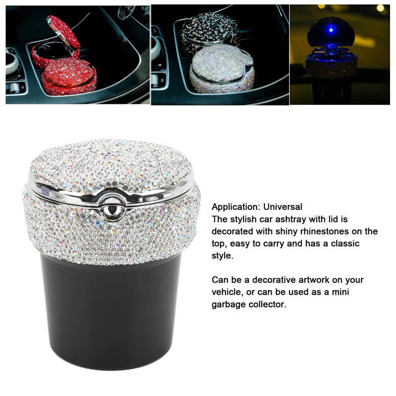 - [ Encrusted] The stylish car ashtray with lid is decorated with shiny rhinestones on the top and has a classic style. It is easy to carry and adds a touch of elegance to your vehicle.