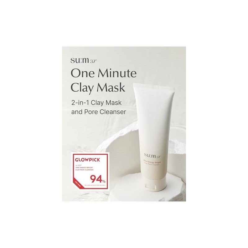 - SU:M ONE MINUTE CLAY PACK CLEANSER (5.07 fl oz) – A dual-action clay mask and cleanser that purifies pores and even out skin tone, delivering a vitality. With a 94% user satisfaction rating (GLOWPICK, a highly regarded Korean beauty review platform), its Fermented Herbal Complex and High-Purity Vitamin C Complex visibly refine your complexion.